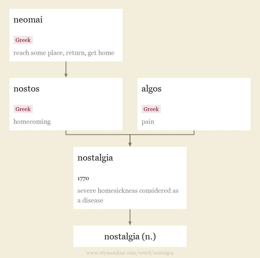 Below, I’m going to offer the Etymonline.com definition of “nostalgia.” It’s too wonderful to excerpt. I hope you enjoy reading it, and might consider supporting them. The etymology dictionary has served as a great resource for me over the past ten years.